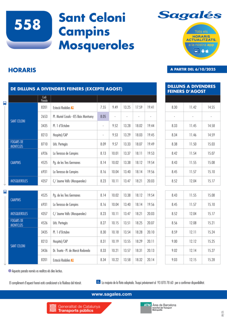 A partir del 6 d’octubre de 2025, entra en vigor el nou horari de la línia 558 de Sagalés.